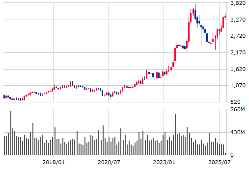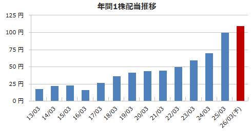 2026年3月期の年間配当予想は110円で、前期比で10円の増配予定。現行株価から算出した配当利回りは約3.25%と比較的高めで、安定したインカムゲインを狙う投資家には魅力的と言えそうですね。