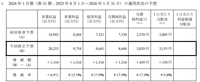 『2026 年 1 月期(第 31 期)の運用状況及び分配金予想の修正に関するお知らせ』から抜粋