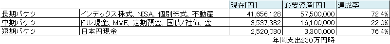 今の支出ベースなので短期バケツは少なめの目標値です。現状でも8,000万円近く必要な計算ですが支出が増えたとしても配当金が増えていけば自ずと必要資産は少なくなっていく見込みです。ある程度当たり付けするために目標値を設定しておかないと立ち位置もわからないですからね。