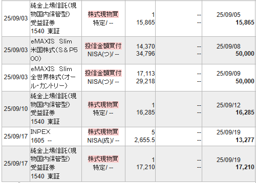 純金ETF(1540)は特定口座による積立ですが、S&P500、オルカンは積立NISAになっています。そろそろ純金ETFは停止しようかと考えてます。INPEXは一度売却したもののNISA枠で毎週少しずつ購入していく予定です。