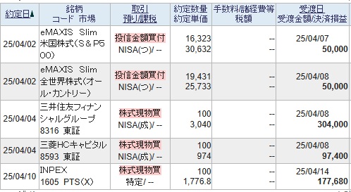 まずは日本株からですが、積立NISAでの買付は悲しきかなクレカ積立なので約定日が4/2となってます。その他は4/4に三井住友FGや三菱HCキャピタルを購入しましたが、肝心な最大下落観測した4/7には変えずに株価が反転し始めた4/10にあわててINPEXだけ購入しちゃってます。。。