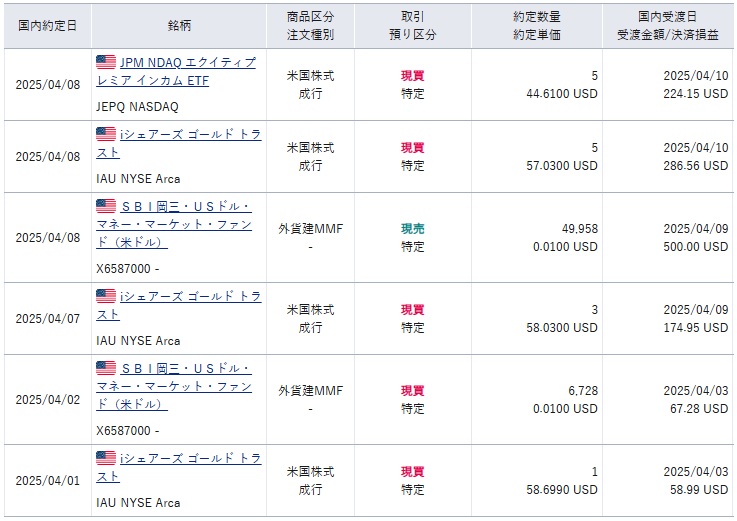 次に米国株ですが、金ETFのIAUとかなりリスキーなJEPQを買い増ししてます。1~3月の株価が平時だったときに債券や金を買い増ししてたものの結果として金の一人勝ちだったのでIAUが下がったときに少しずつ買い増ししてました。持ち株はあまり欲しいところまで下がってくれなかったので下落が大きかったJEPQを買い増ししてた印象です。