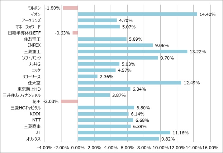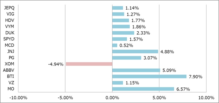 7月末からのリターンになります。XOMだけマイナスですがそれ以外の銘柄はすべてプラスです。